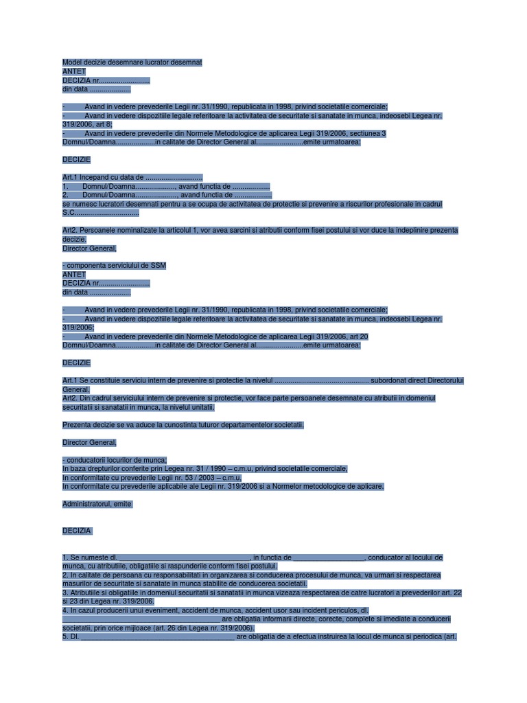 Decizie Delegare Atributii In Domeniul Ssm Source from : https://es.scribd.com/doc/249057477/DECIZIE-Delegare-Atributii-in-Domeniul-SSM Propunerea legislativă pentru completarea art. 1.218 din 6 septembrie 2006 (*actualizată*) privind stabilirea cerinţelor minime de securitate şi sănătate în muncă pentru asigurarea protecţiei lucrătorilor împotriva riscurilor legate de prezenţa agenţilor chimici art. Legea securitatii si sanatatii in munca. Care sunt documentele necesare intocmirii unui dosar ssm, cadrul legislativ si sablonul/sabloanele folosite? A) din legea securitatii si sanatatii in munca nr.