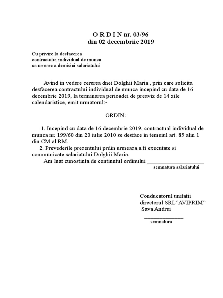 Acesta nu poate depasi 20 de zile lucratoare in cazul salariatilor din pozitii de executie, respectiv 45 in cazul celor cu functie de conducere. Va prezentam in continuare un model de preaviz pentru concedierea individuala modele de fise de post si evaluare pentru primarii. Pe de alta parte, in cazul concedierii ati perfortat. Acest tip de demisie se mai numeste si demisie fara acordul partilor) este cel convenit de părţi în contractul individual de muncă sau, după caz, cel prevăzut în contractele colective de muncă aplicabile şi nu poate fi mai mare de 20 de zile lucrătoare pentru. 20 de zile lucrătoare pentru salariaţii cu funcţii de execuţie;