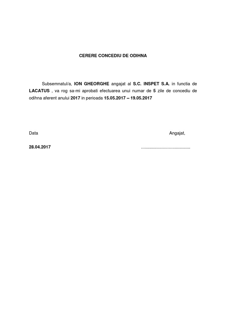 vizitati articolul complet aici : http://www.contabun.ro/2017/05/23/model-cerere-concediu-de-odihna/ Durata concediului anual de odihna este de _____ zile lucratoare, in raport cu durata muncii (norma intreaga, fractiune de norma). Vizionează online filme și seriale netflix sau difuzează direct pe smart tv console de jocuri pc mac mobil tabletă și multe altele. Este important să reții că există mai multe tipuri de concedii medicale, iar valoarea lor este cuprinsă între 75% din salariul brut și 100%.